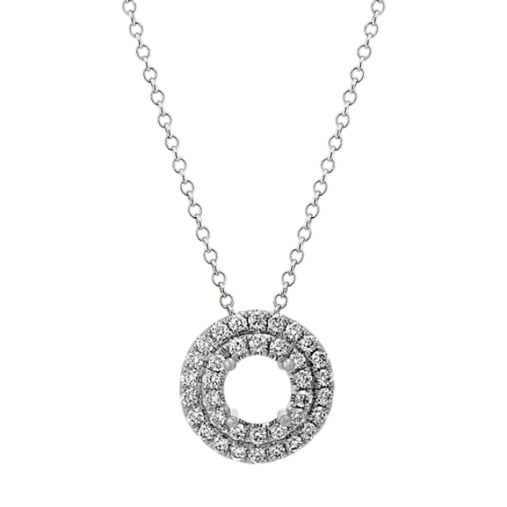 This shimmering design is crafted of quality 14 karat white gold and beautifully displays 36 sparkling round pave-set natural diamonds, at approximately .31 carat total weight. These shimmering gemstones serve as the perfect backdrop to the round gemstone of your choice at approximately 5mm wide. The design hangs from an adjustable 22-inch matching cable chain and measures approximately 1/2 of an inch long. For more information on selecting your center stone, Live Chat or call an online customer service representative at 1-866-467-4263, or visit one of our store locations.