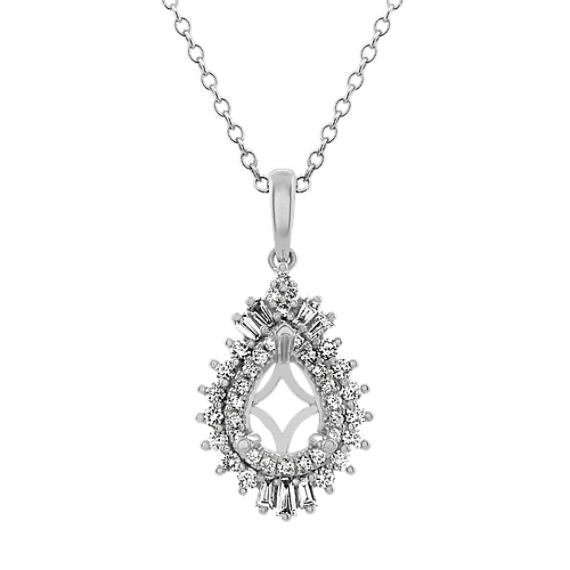 Seven sparkling pear-shaped natural diamonds (approx. .24 carat TW) and 38 round natural diamond (approx. .30 carat) serve as the perfect backdrop to the pear-shaped gemstone of your choice at approximately 1.00 carat in this dazzling 14 karat white gold pendant. The design measures 1 inch long and hangs from a matching 24-inch diamond cut cable chain. For more information on selecting your center stone Live Chat or call an online customer service representative at 1-866-467-4263 or visit one of our store locations.