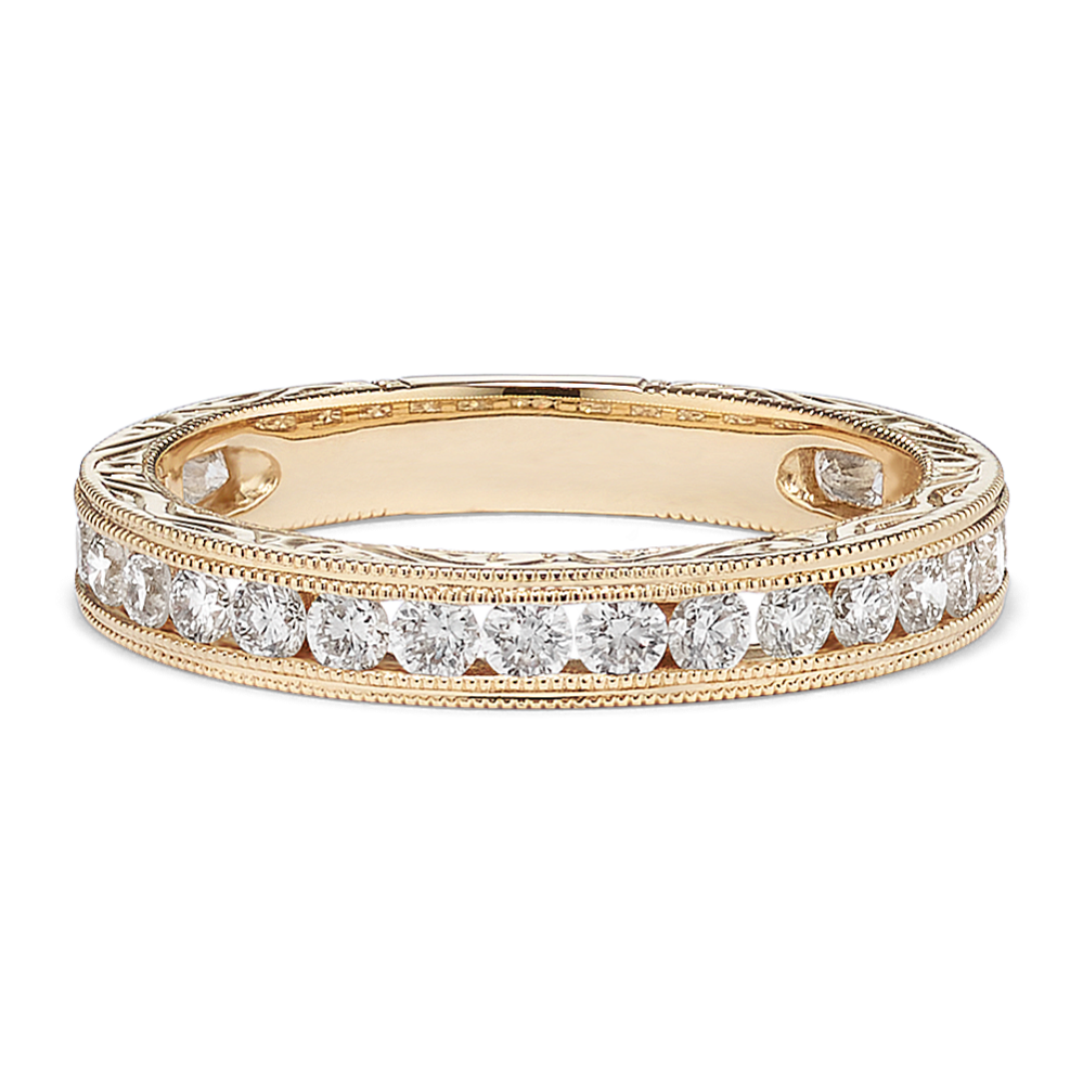 A channel-set engagement ring with vintage-inspired charm, including milgrain detailing and swirled engravings. It’s crafted in warm 14-karat yellow gold with graduated natural diamond accents. For more information on selecting your center stone, live chat online, call a customer service representative at 1-866-467-4263, or visit one of our store locations.