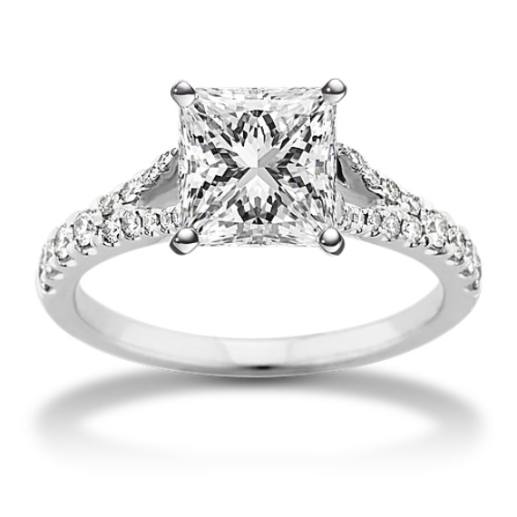 This beautiful cathedral engagement ring features natural diamond pavé in the band that continues onto the prongs for extra sparkle. Crafted in bright 14-karat white gold, it also has hidden crossover detailing visible along the profile. Just add the center stone of your dreams to make it complete. For more information on selecting your center stone, live chat online, call a customer service representative at 1-866-467-4263, or visit one of our store locations.