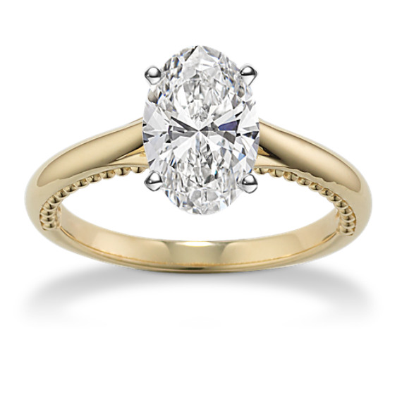 This sleek 14-karat yellow gold engagement ring features a simple top-down view with ornate details hidden along the sides. Milgrain lines the profile, giving way to a natural diamond accent on either side of the setting. Add the center stone of your dreams to complete this elegant design. For more information on selecting your center stone, Live Chat online, call a customer service representative at 1-866-467-4263, or visit one of our store locations.