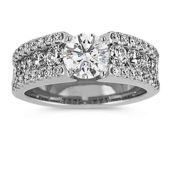 The band of this engagement ring offers bold sparkle with a triple row design. It features a center row of natural diamonds bordered by smaller accent rows. Crafted in bright 14-karat white gold, this gorgeous ring is the perfect backdrop for the center stone of your dreams. For more information on selecting your center stone, live chat online, call a customer service representative at 1-866-467-4263, or visit one of our store locations.