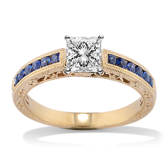 A channel-set engagement ring with vintage-inspired charm, including milgrain detailing and ornate engravings. It’s crafted in warm 14-karat yellow gold with natural sapphire accents. For more information on selecting your center stone, live chat online, call a customer service representative at 1-866-467-4263, or visit one of our store locations.