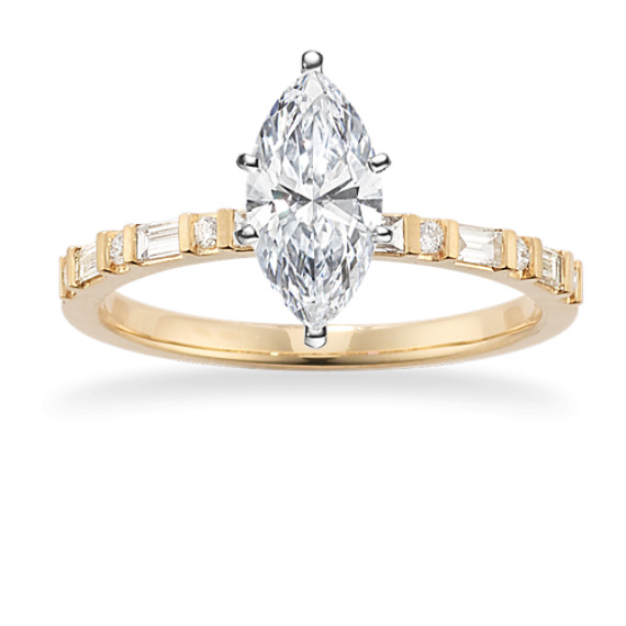 Natural diamond accents in alternating round and baguette shapes will sparkle alongside the center stone of your dreams in this elegant 14-karat yellow gold engagement ring. For more information on selecting your center stone, live chat online, call a customer service representative at 1-866-467-4263, or visit one of our store locations.
