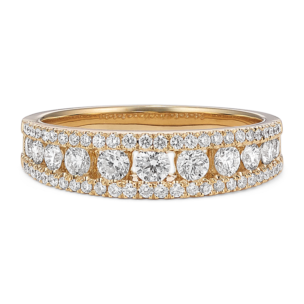 The band of this engagement ring offers bold sparkle with a triple row design. It features a center row of natural diamonds bordered by smaller accent rows. Crafted in warm 14-karat yellow gold, this gorgeous ring is the perfect backdrop for the center stone of your dreams. For more information on selecting your center stone, live chat online, call a customer service representative at 1-866-467-4263, or visit one of our store locations.