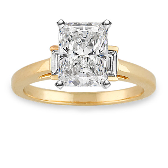 An elegant three-stone design with baguette natural diamond side stones. This engagement ring is crafted in warm 14-karat yellow gold. For more information on selecting your center stone, live chat online, call a customer service representative at 1-866-467-4263, or visit one of our store locations.
