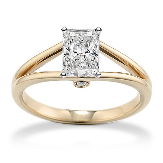 The center stone of your dreams will shine in this sleek split-shank engagement ring. Crafted in warm 14-karat yellow gold, it features a bezel-set natural diamond accent on either side of the setting. For more information on selecting your center stone, Live Chat online, call a customer service representative at 1-866-467-4263, or visit one of our store locations.
