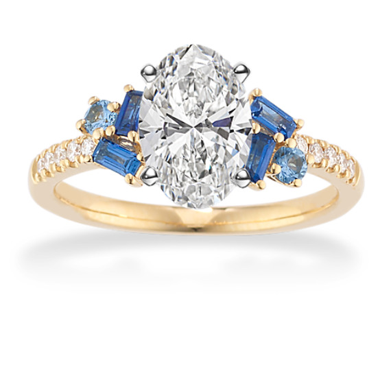 This engagement ring features fanciful clusters of blue natural sapphires on either side of the setting for a modern take on the classic three-stone look. Crafted in warm 14-karat yellow gold, it also features a natural diamond pavé band for gorgeous sparkle alongside the center stone of your dreams. For more information on selecting your center stone, live chat online, call a customer service representative at 1-866-467-4263, or visit one of our store locations.