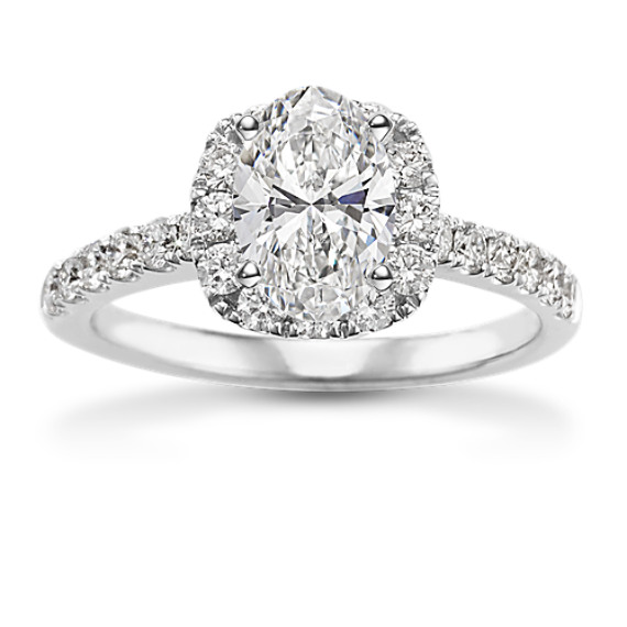 This beautiful halo engagement ring features natural diamond pavé for a classic look and plenty of sparkle. Crafted in bright 14-karat white gold, it features additional natural diamond accents visible along the sides under the halo. Add the center stone of your dreams to complete this sparkling look. For more information on selecting your center stone, live chat online, call a customer service representative at 1-866-467-4263, or visit one of our store locations.