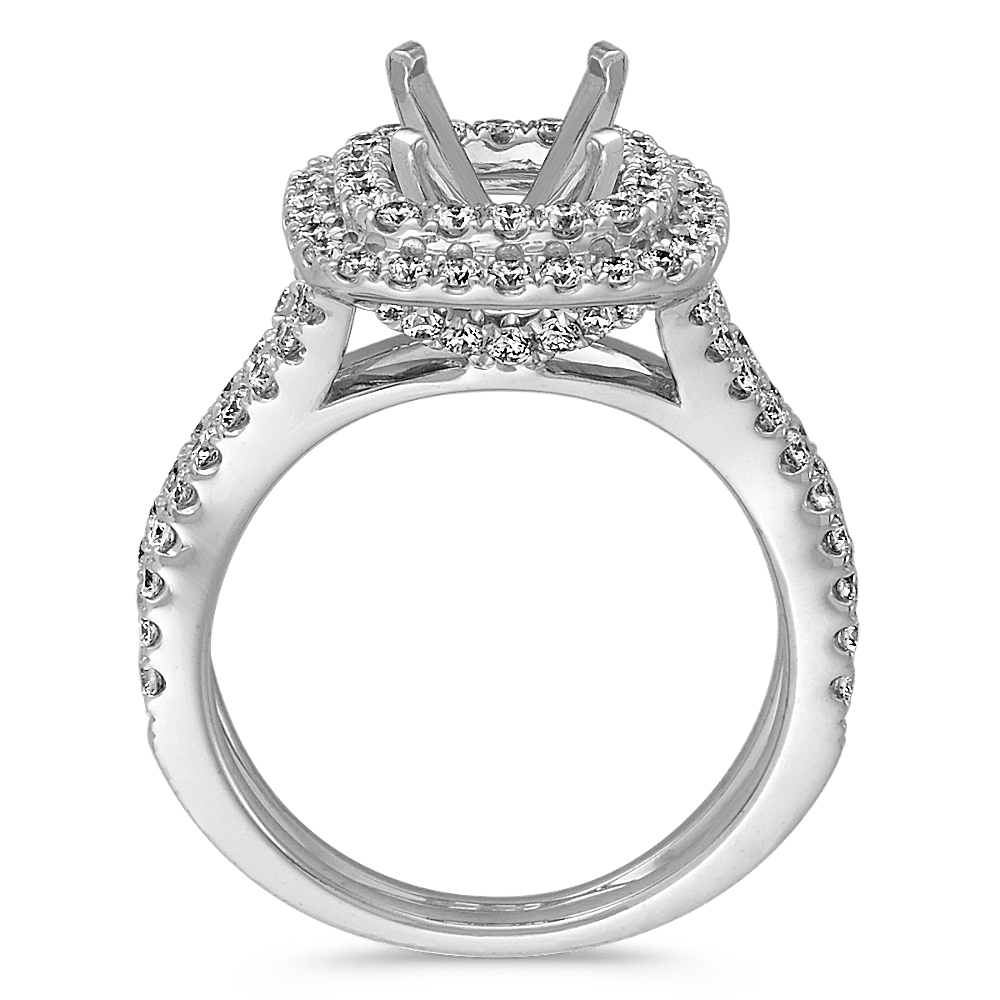 Ninety-eight brilliant round natural diamonds, at approximately 1.10 carat total weight, are beautifully pave-set in this engagement ring setting and create a dazzling background to the center 1.50 carat natural diamond of your choice. The design is crafted of quality 14 karat white gold and features a double halo and a split shank band measuring 5mm wide.