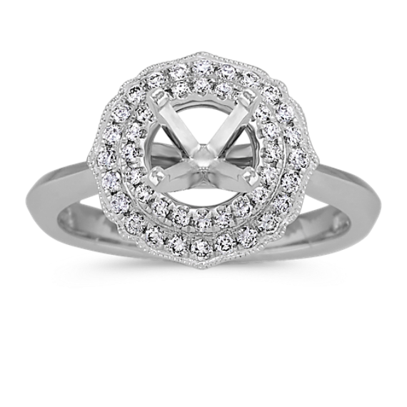 This heavenly engagement waits to be completed by the center .75 carat natural diamond of your choice. Your chosen center gemstone will be held in a double halo setting with a scintillating backdrop complete wth 44 round natural diamonds, at approximately .28 carat total weight. Each natural diamond has been hand-selected for superior brilliance and set in quality platinum. The band of this ring measures 2.5mm wide while the halo measures 12.5mm wide at the center.