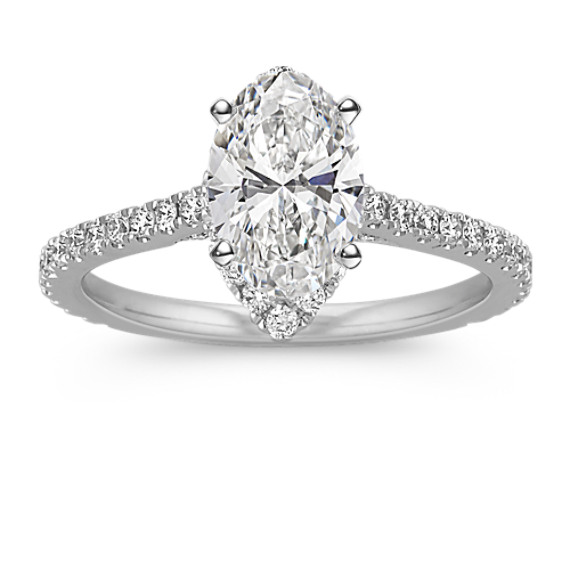 The marquise center stone of your dreams will shine in this dazzling engagement ring setting, which features natural diamond pavé in the band and halo. Crafted in bright 14-karat white gold, this ring has a bejeweled cathedral for sparkle from the sides. For more information on selecting your center stone, live chat online, call a customer service representative at 1-866-467-4263, or visit one of our store locations.