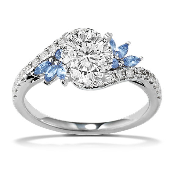 Natural diamond pavé winds its way up the band of this engagement ring, meeting ice blue natural sapphires at the top to form a stunning floral halo. Add the center stone of your dreams to this 14-karat white gold ring to complete its beautiful botanical design. For more information on selecting your center stone, live chat online, call a customer service representative at 1-866-467-4263, or visit one of our store locations.