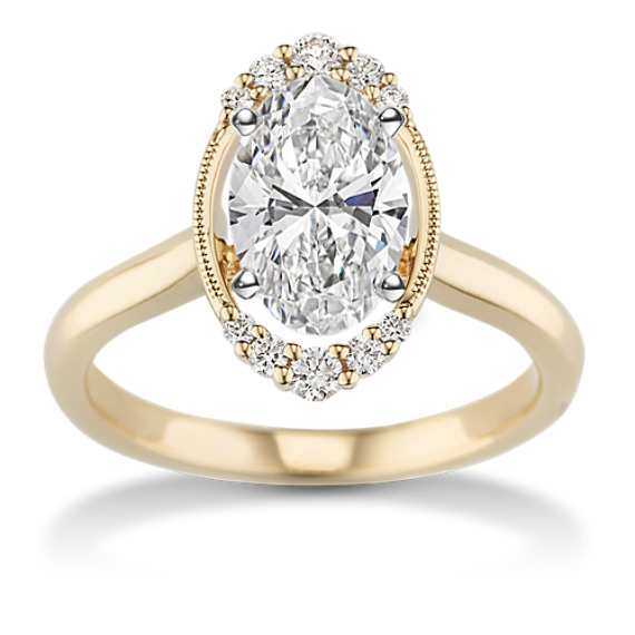 Accentuate the oval center stone of your dreams with this unique halo engagement ring. Crafted in warm 14-karat yellow gold, it features natural diamond accents at either end of the halo with ornate milgrain detailing in between. For more information on selecting your center stone, live chat online, call a customer service representative at 1-866-467-4263, or visit one of our store locations.