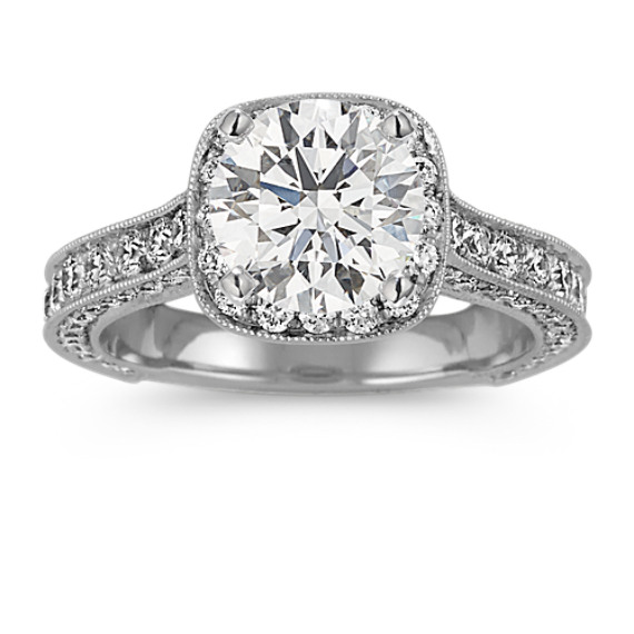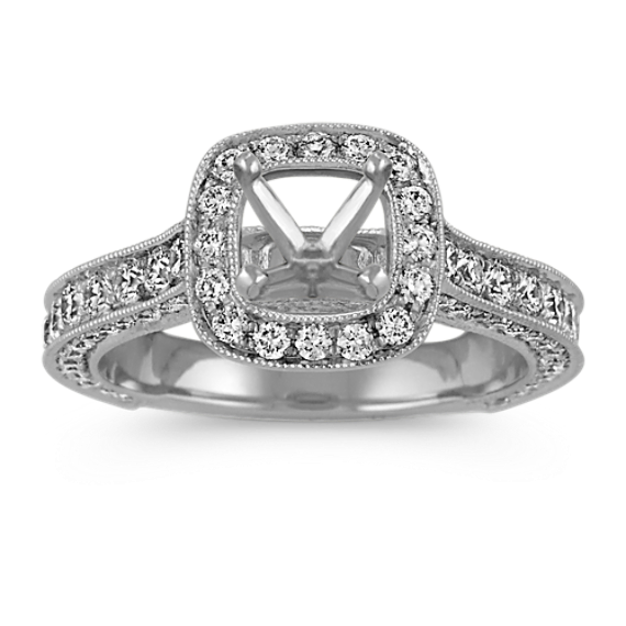 Sparkle abounds in this standout engagement ring crafted of superior quality platinum. One hundred and twelve round natural diamonds, at approximately 1.21 carats total weight, are pav´-set throughout the ring design and are accompanied by milgrain detailing for a vintage style. Popular center natural diamond choices to complete this setting include .75 carat round, cushion cut, or princess cut natural diamond. The ring is 9.8mm wide at the center and 3mm at the band.