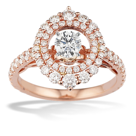 Add extra sparkle to the round center stone of your dreams with this double halo engagement ring, featuring natural diamond accents throughout. The diamonds in the outer halo graduate in size at either end, giving it a unique shape. Crafted in romantic 14-karat rose gold, it features hidden details along the sides, with twisting filigree and an additional diamond accent right under the halo. For more information on selecting your center stone, live chat online, call a customer service representative at 1-866-467-4263, or visit one of our store locations.