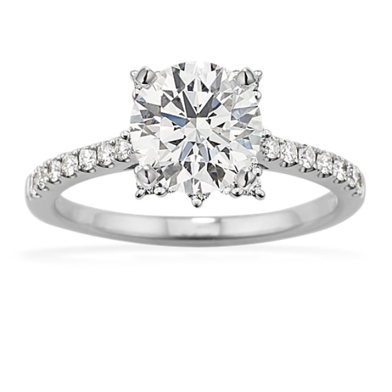 This engagement ring features a halo of round natural diamond accents that alternate in size, creating a beautiful scalloped look. Crafted in bright 14-karat white gold, it also features ornate scrollwork under the halo and a natural diamond pavé band for more sparkle. Add the princess cut center stone of your dreams to complete this elegant look. For more information on selecting your center stone, live chat online, call a customer service representative at 1-866-467-4263, or visit one of our store locations.