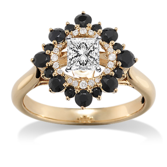 This regal double halo design delivers a fiery inner halo of natural diamond accents bordered by a beautiful outer halo of natural black sapphires alternating in size. Ornate 14-karat yellow gold filigree at the cathedral rounds out this stunning, unique look that is ready for the round center stone of your dreams. For more information on selecting your center stone, Live Chat or call an online customer service representative at 1-866-467-4263, or visit one of our store locations.