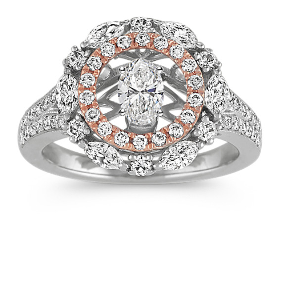 This stunning double halo wedding set is crafted from quality 14 karat white and rose two-tone gold. Six marquise natural diamonds (approx. .35 carat TW), and 46 round natural diamonds (approx. .50 carat TW), have been hand matched for brilliant sparkle and fire to complete this vibrant ring. Simply add the center gemstone of your choice at approximately 1.25 carats to complete the bold look. This ring measures 14.5 at the center and has a total gem weight of approximately .85 carat.