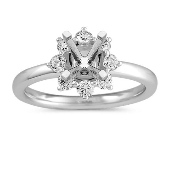 Crafted in bright 14-karat white gold, the romantic, icy halo of this engagement ring setting is waiting to add sparkle to the round center stone of your choice.