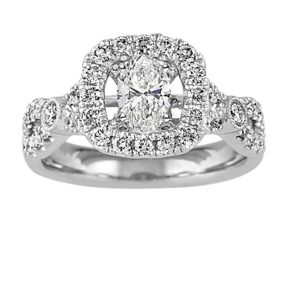Sixty-four round pave-set natural diamonds, at approximately 0.65 carat total weight, serve as accents to the round center gemstone of your choice in this elegant swirling infinity halo engagement ring. Each natural diamond has been hand-selected for brilliance and sparkle, and is set in superior quality platinum measuring 3.3mm wide at the band.