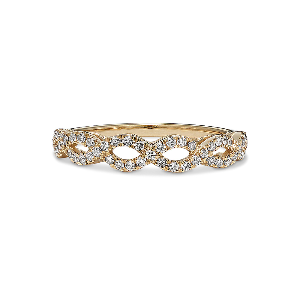 Like the winding branches of a willow tree, natural diamond pavé and warm 14-karat yellow gold twist into a beautiful infinity design along the band of this engagement ring. The diamond accents shine with superior sparkle and fire, creating the ideal backdrop for the center stone of your dreams. For more information on selecting your center stone, Live Chat online, call a customer service representative at 1-866-467-4263, or visit one of our store locations.