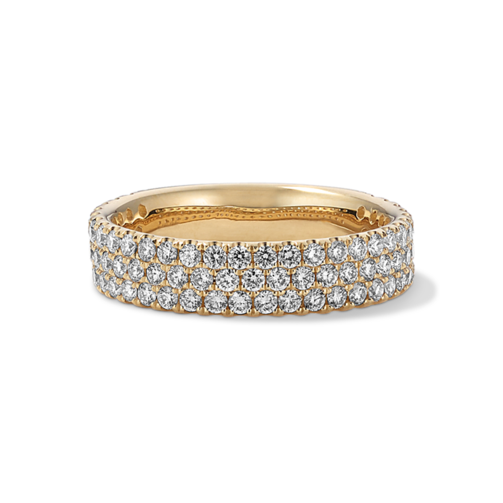 This bold engagement ring features three rows of natural diamond pavé, creating a beautiful backdrop for the center stone of your dreams. Warm 14-karat yellow gold is the perfect complement to the diamonds. For more information on selecting your center stone, live chat online, call a customer service representative at 1-866-467-4263, or visit one of our store locations.