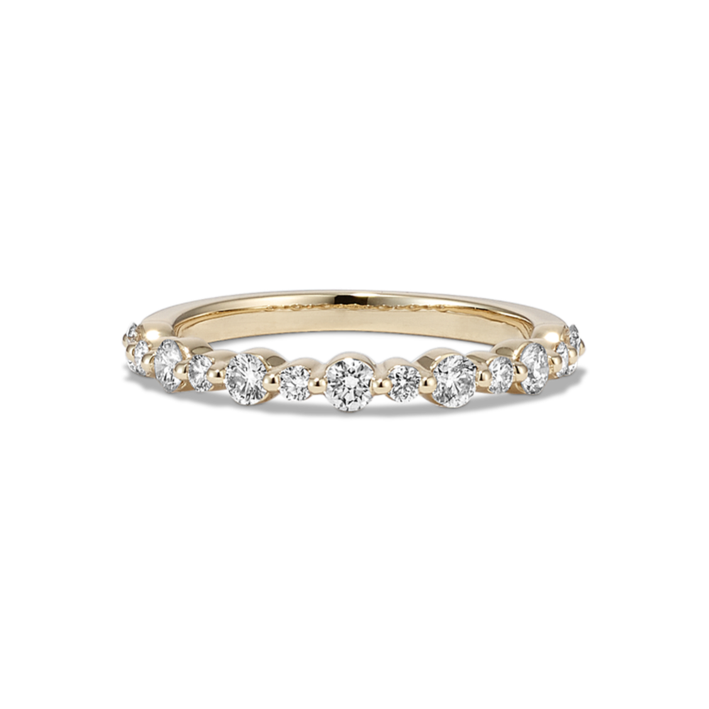 Sparkling natural diamond accents alternate in size along the band of this beautiful engagement ring. Crafted in warm 14-karat yellow gold, a minimal single-prong setting showcases their gorgeous round shape. Complete this elegant look with the center stone of your dreams. For more information on selecting your center stone, live chat online, call a customer service representative at 1-866-467-4263, or visit one of our store locations.