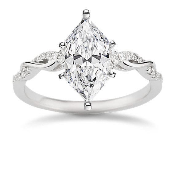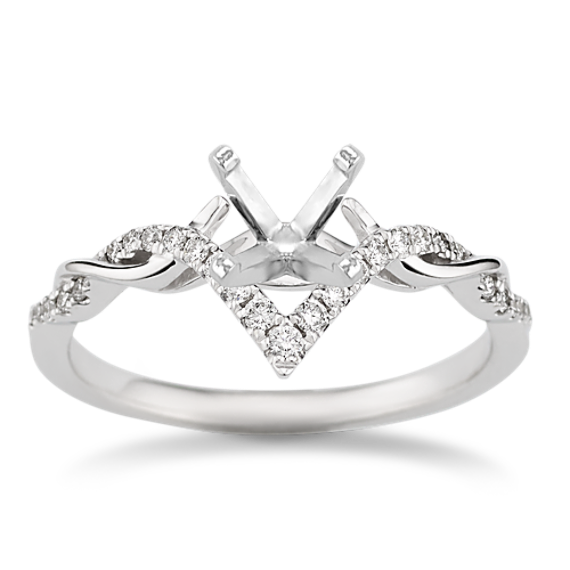 Bright 14-karat white gold and natural diamond pavé twist their way up the band of this contour engagement ring. Its deep V shape is designed to frame your choice of center stone, offering beautiful sparkle and unique shape. For more information on selecting your center stone, live chat online, call a customer service representative at 1-866-467-4263, or visit one of our store locations.