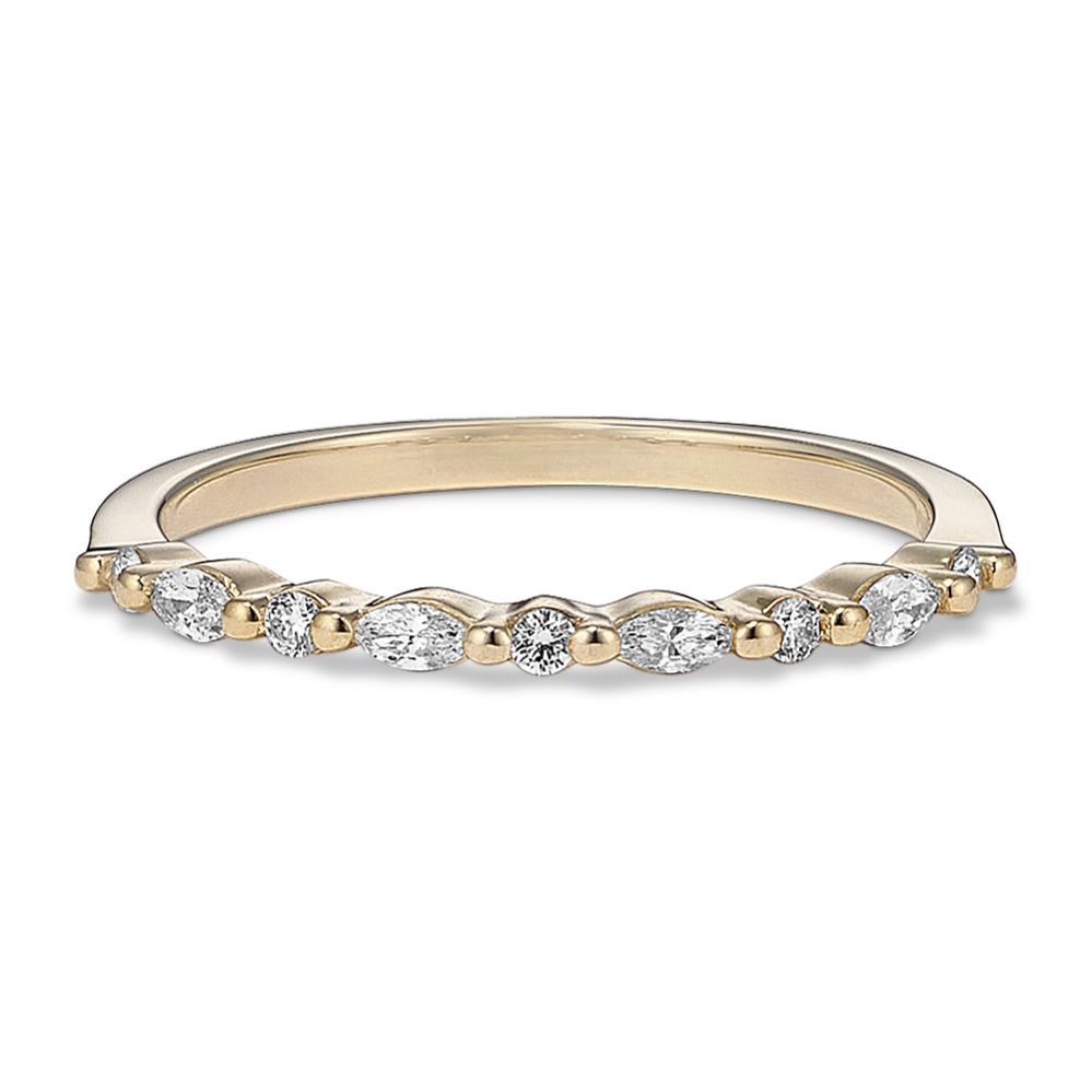 Natural diamond accents in round and marquise shapes give the band of this engagement ring a beautiful scalloped look with plenty of sparkle. Crafted in warm 14-karat yellow gold, it makes an elegant backdrop for the center stone of your dreams. For more information on selecting your center stone, live chat online, call a customer service representative at 1-866-467-4263, or visit one of our store locations.