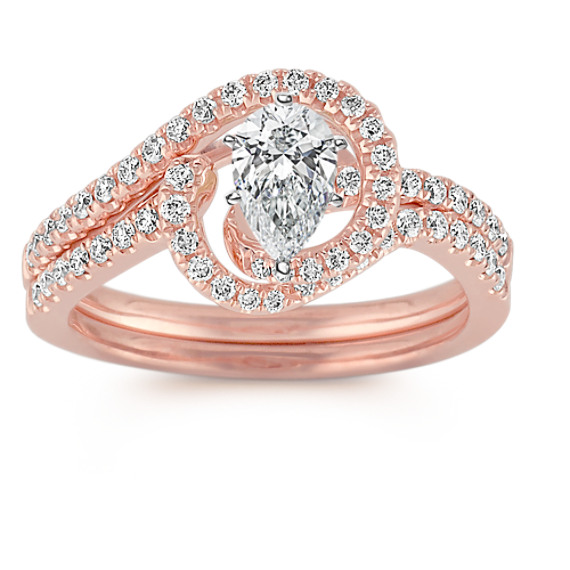 This ultra-charming wedding set, in quality 14 karat rose gold, contains 57 round natural diamonds, at approximately .37 carat total weight. When worn together, the bands create a lovely swirl design that will perfectly accent the center gemstone of your choice. This set measures approximately 3.2mm in bandwidth (at the base) when worn together.