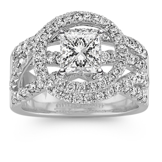A gorgeous halo is created by the swirl design of this engagement ring setting and accented by pavé-set round natural diamonds. Ninety-five round natural diamonds, at approximately 1.35 carat total weight, beautify this setting and are set in quality 14 karat white gold. To make this style your own, add the round natural diamond of your choice ranging in size up to 2.00 carats.