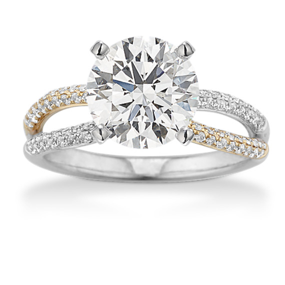 This engagement ring features a crossover band in 14-karat white and 14-karat yellow gold for a gorgeous two-tone look. Natural diamond pavé creates a sparkling backdrop for the center stone of your dreams. For more information on selecting your center stone, live chat online, call a customer service representative at 1-866-467-4263, or visit one of our store locations.