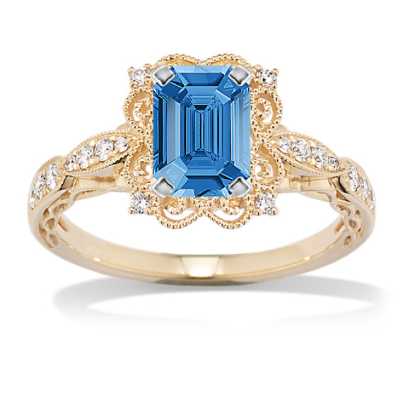 Swirling scrolls of milgrain detail and hand-matched natural diamond accents await the round, cushion, emerald, or Asscher cut center stone of your choice in this secure, vintage-inspired halo setting. Intricate scrollwork in bright 14-karat yellow gold arcs along the profile view rounding out the vintage charm.
