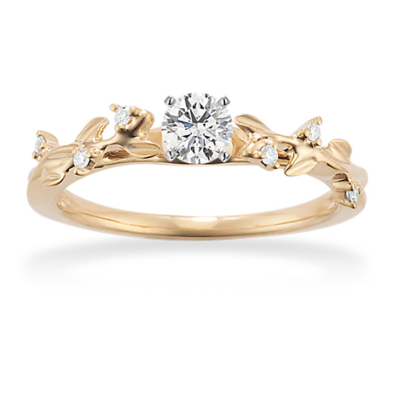 Warm 14-karat yellow gold leaves are dotted with natural diamond accents giving a dreamy, botanical feel to this engagement ring. It features a cathedral setting that will beautifully showcase the center stone of your choice. For more information on selecting your center stone, live chat online, call a customer service representative at 1-866-467-4263, or visit one of our store locations.