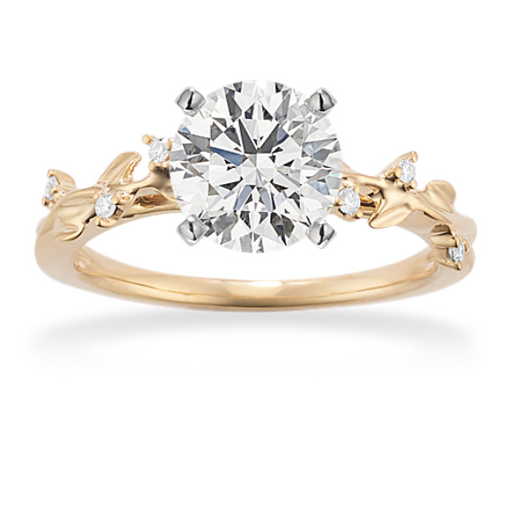 Warm 14-karat yellow gold leaves are dotted with natural diamond accents giving a dreamy, botanical feel to this engagement ring. It features a cathedral setting that will beautifully showcase the center stone of your choice. For more information on selecting your center stone, live chat online, call a customer service representative at 1-866-467-4263, or visit one of our store locations.