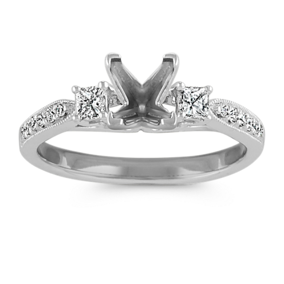 Brilliant hand-matched natural diamonds provide the perfect backdrop to the center gemstone of your choice. Two princess cut natural diamonds, at approximately .21 carat TW, serve as brilliant side natural diamonds. Twelve round natural diamonds, at approximately .18 carat TW, are prong-set into the quality 14 karat white gold band, providing a glamorous, modern look. The total natural diamond weight is approximately .39 carat.