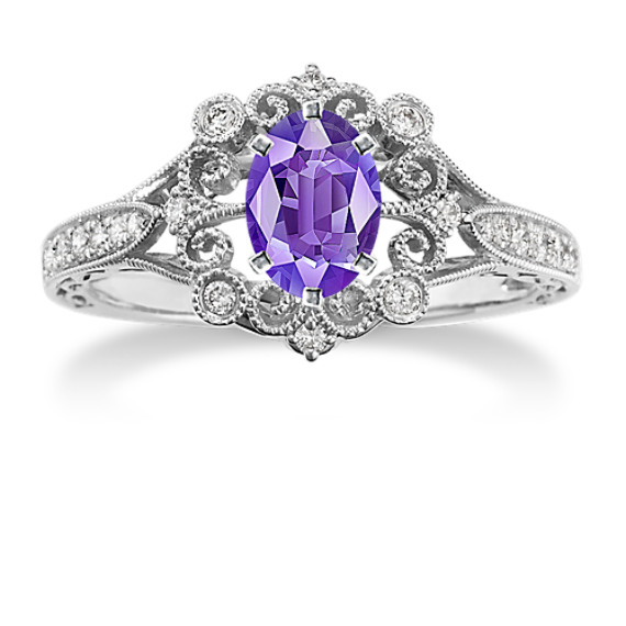 Natural diamond accents dot the halo and band of this gorgeous, vintage-inspired engagement ring. Crafted in bright 14-karat white gold, it features delicate milgrain detailing and scrolling filigree throughout the design. Complete this ring with the round center stone of your dreams. For more information on selecting your center stone, live chat online, call a customer service representative at 1-866-467-4263, or visit one of our store locations.