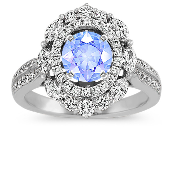 Round and marquise natural diamond accents create an ornate double halo in this stunning 14-karat white gold engagement ring. It features milgrain detailing and beautiful filigree for a vintage-inspired look and two rows of natural diamond accents in the band for extra sparkle. Add the round center stone of your dreams to make it complete. For more information on selecting your center stone, live chat online, call a customer service representative at 1-866-467-4263, or visit one of our store locations.