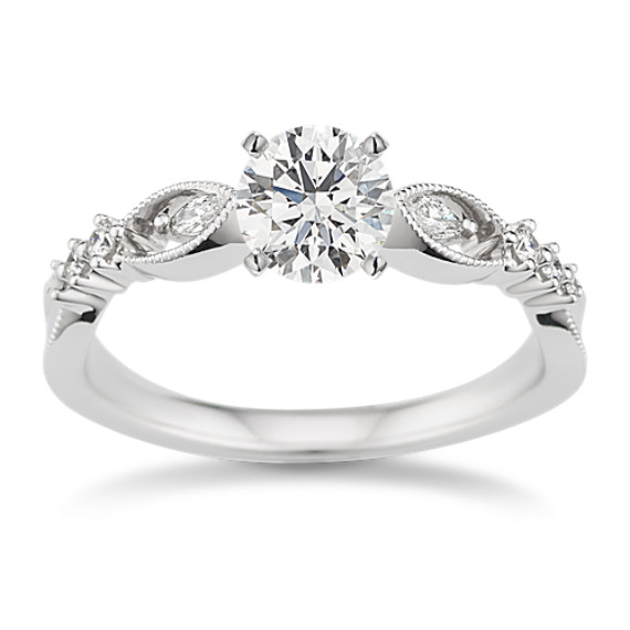 The scalloped band of this engagement ring features two marquise natural diamond accents that seem to float inside lacy cutouts. Crafted in bright 14-karat white gold, its delicate milgrain detailing offers vintage flair, while additional natural diamond accents further down the band add more sparkle. The center stone of your choice will complete this dreamy design. For more information on selecting your center stone, live chat online, call a customer service representative at 1-866-467-4263, or visit one of our store locations.