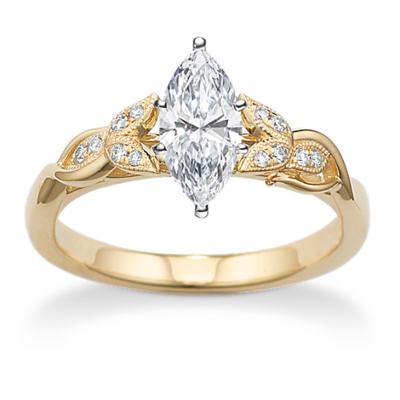 A nature-inspired engagement ring with leaf accents and a beautiful lotus visible along the sides of the ring. It’s crafted in warm 14-karat yellow gold with natural diamond accents. For more information on selecting your center stone, live chat online, call a customer service representative at 1-866-467-4263, or visit one of our store locations.