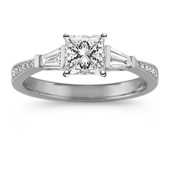 Twelve round pavé-set natural diamonds (approx. .05 carat TW) and two tapered baguette natural diamonds (approx. .20 carats TW), serve as accents to the center gemstone of your choice in this elegant vintage-inspired engagement ring. Each natural diamond has been hand-selected for fire and sparkle, and is set in quality 14 karat white gold. This 3.1mm wide engagement ring has a total weight of .25 carat.
