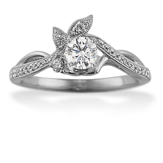 Let the center stone of your choice bloom from the unique botanical design of this engagement ring setting. Natural diamond accents shine with hand-matched color, clarity, and sparkle along the band and decorative leaves, while milgrain borders in bright 14-karat white gold lend a vintage flair. For more information on selecting your center stone, Live Chat online, call a customer service representative at 1-866-467-4263, or visit one of our store locations.