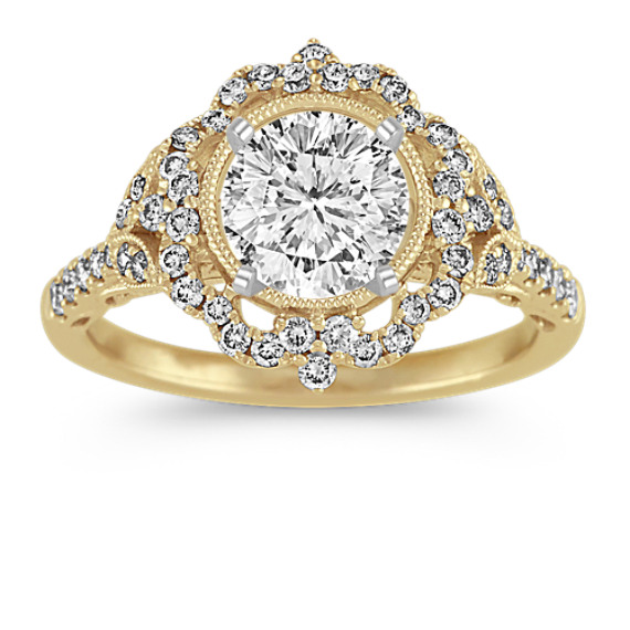 Crafted from quality 14 karat yellow gold, 50 brilliant round natural diamonds, at approximately 0.41 carat total weight, sparkle throughout this vintage-inspired round halo engagement ring. This engagement ring measures 13.5mm at the center and is best suited for a round or cushion cut center gemstone at approximately 1.00 carat. Select the natural diamond or natural gemstone of your choice to create your unique and perfect ring.