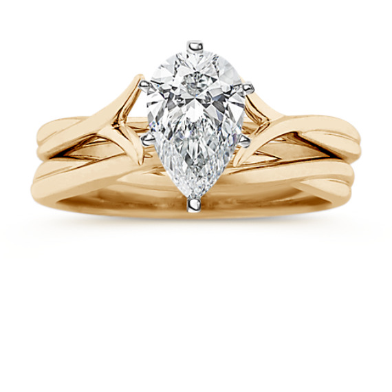 This modern design is a Shane Co. exclusive. Crafted from superior quality 14 karat yellow gold, a smooth, polished finish gives this piece elegance and shine. This unique wedding set with a split shank serves to highlight the center gemstone of your choice.