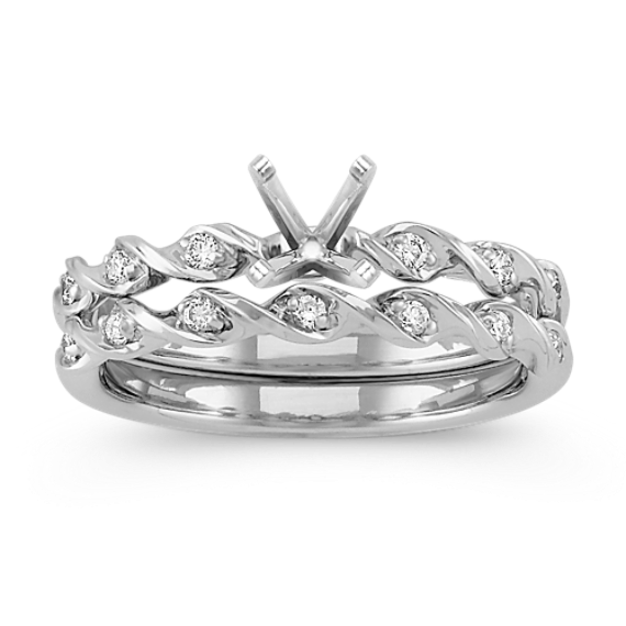 The added twist of this brilliant wedding set, featuring 13 round natural diamonds at approximately .13 carat total weight, creates an intriguing design. Each natural diamond has been hand-matched for exceptional beauty and sparkle. These magnificent gems are set in a unique 14 karat white gold setting. To complete the look, add the center gemstone of your choice.
