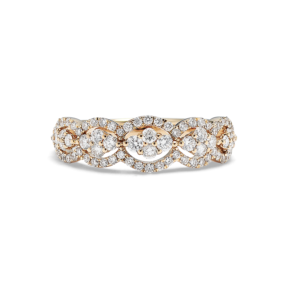 This wedding set puts a modern spin on the classic combination of natural diamonds and 14-karat yellow gold with its subtle twisted shape. The hand-matched diamonds seamlessly meld into the design, flowing along the profile of each ring for sparkle from the side. For more information on selecting your center stone, Live Chat online, call a customer service representative at 1-866-467-4263, or visit one of our store locations.