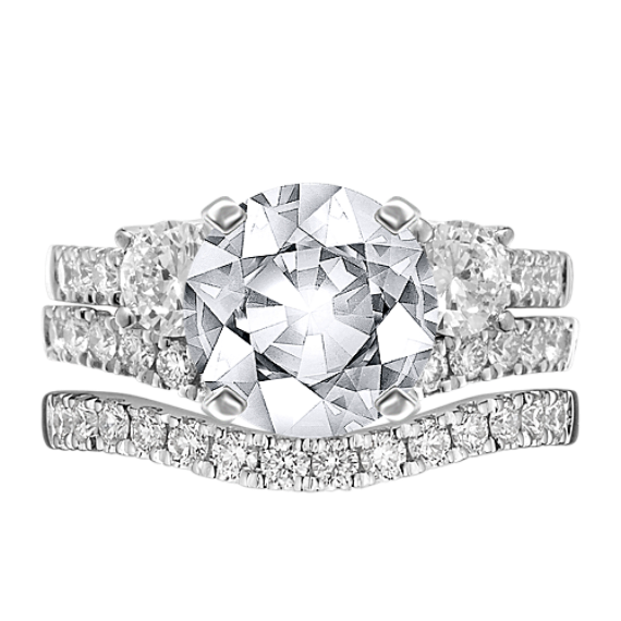 Represent past, present, and future with the three-stone design of this beautiful wedding set. The engagement ring features a pair of natural diamond side stones that will sparkle alongside the center stone of your dreams, while the wedding band is perfectly contoured to hug the engagement ring. Crafted in luxurious platinum, both bands feature natural diamond pavé for a cohesive look. For more information on selecting your center stone, live chat online, call a customer service representative at 1-866-467-4263, or visit one of our store locations.