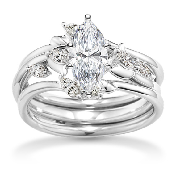 Marquise natural diamond accents give a feathery, ethereal look to this 14-karat white gold wedding set. The ring guard features a subtle contour shape, which is designed to frame your center stone on both sides. The engagement ring best fits an oval diamond in an east-west (horizontal) orientation but can accommodate other center stone shapes and positions. For more information on selecting your center stone, Live Chat online, call a customer service representative at 1-866-467-4263, or visit one of our store locations.