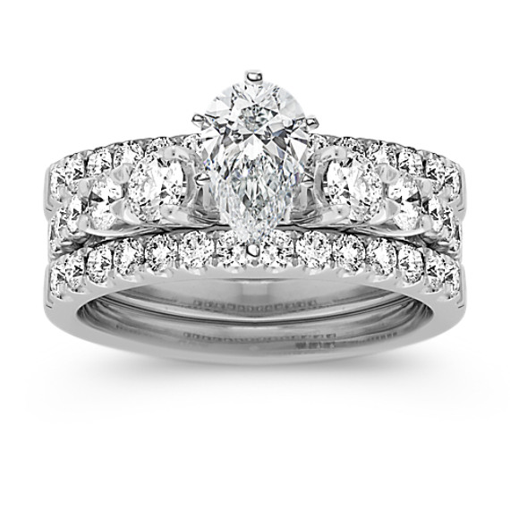 This exquisite design features 38 round natural diamonds at approximately 1.05 carats total weight. Each lovely, hand-matched gem is pavé-set in superior quality 14 karat white gold. Three rows of natural diamonds serve as the perfect backdrop to the center gemstone of your choice. This set measures approximately 6.5mm in bandwidth (at the base) when worn together.
